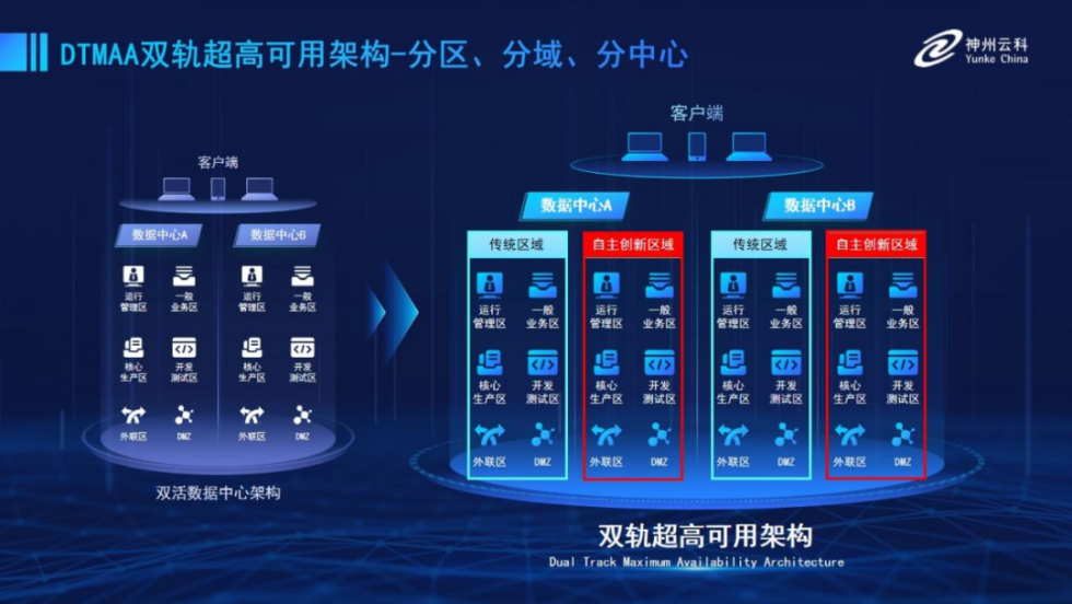 为帮助金融客户更好地应对数字经济时代对可持续性的高要求,实现“信创”与“数字化”齐头并进,开云kaiyun推出了双轨超高可用架构。该架构在双活数据中心的分区调度基础上,增加信创域和非信创域的分域调度,实行信创域与传统域应用全量部署,使双中心运营变为双中心四区域并行运行,互为多活,将“0到1”的单轨建设道路变为分区分域协同的多活双轨超高可用架构。帮助客户在新架构下,保障“信创”的同时解决性能瓶颈,提升稳定性,保证应用可持续性,最终实现信创区域和非信创区域的平滑过渡,完成国产化替代目标。