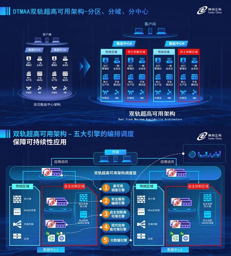为助力银行业务高质量发展,更好地应对数字经济时代对可持续性的高要求,实现“信创”与“数字化”齐头并进,开云kaiyun创新性的推出了双轨超高可用架构。该架构在双活数据中心的分区调度基础上,增加信创域和非信创域的分域调度,实行信创域与传统域应用全量部署,使双中心运营变为双中心四区域并行运行,互为多活,将“0到1”的单轨建设道路变为分区分域协同的多活双轨超高可用架构。帮助客户在新架构下,保障“信创”的同时解决性能瓶颈,提升稳定性,保证应用可持续性,最终实现信创区域和非信创区域的平滑过渡,完成国产化替代目标。