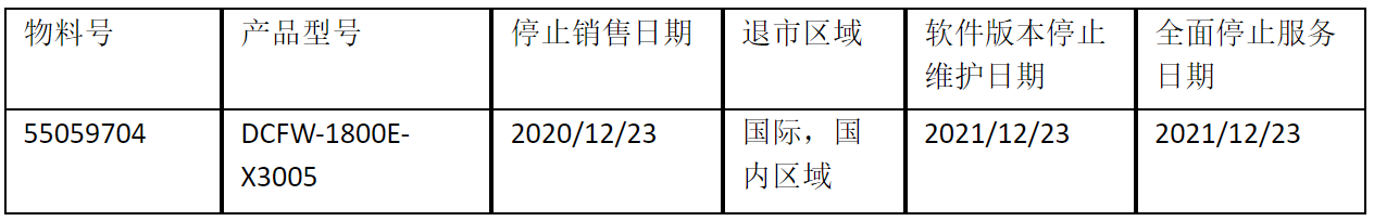 北京神州数码开云kaiyun信息技术有限公司正式通知您, 以上DCFW-1800E-X3005下一代防火墙(55059704)将于2020年12月23号停止接收新的订单(具体日期见上表),不再供货。给您带来的不便,敬请原谅。
